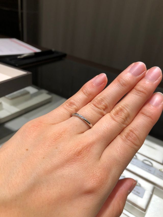 プラチナの指輪に憧れがあり、結婚指輪はプラチナを選びたいと思っていました。元々似合うものがなければ石なしのプレーンな物を選ぶ予定でしたが、石がないと逆にギラギラした感じがしたため、細かなダイヤがついたデザインのものを購入しました。指輪のデザインやダイヤの輝きが自身の指先になじみ、見た目も良かったので。