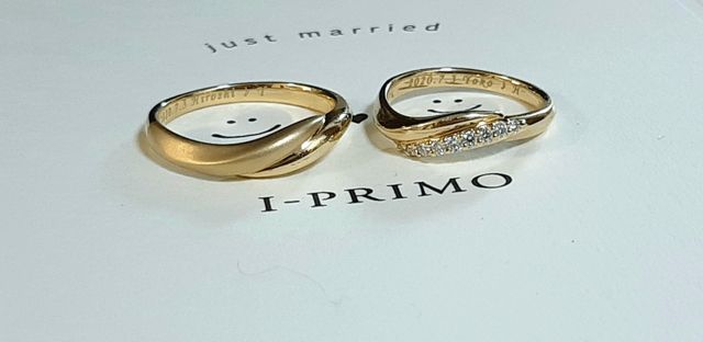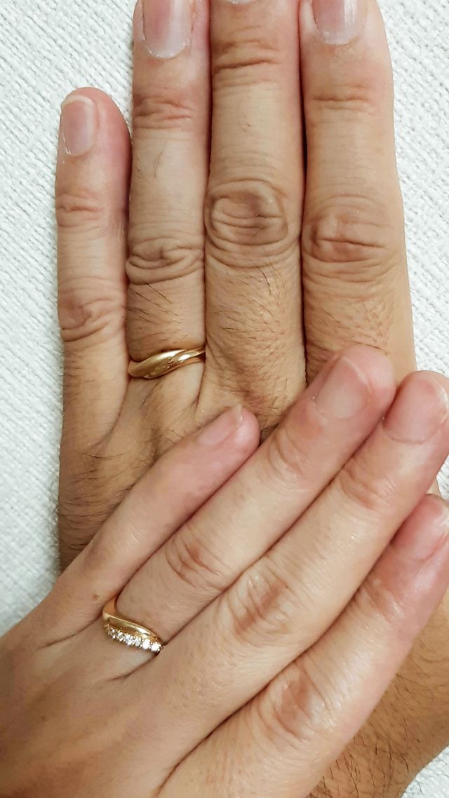 夫の指輪は、プラチナにしようとしていましたが、片方のウェーブをマットにする事により派手に見えず、本人も気に入りゴールドにしました。