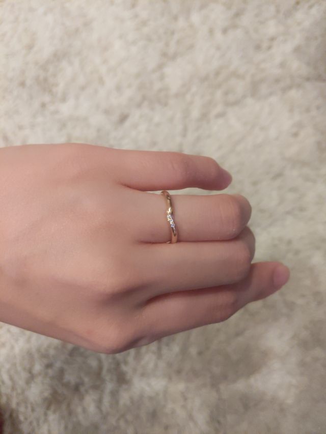 柔らかい印象の指輪か、おしゃれな印象の指輪で、かなり悩みました。最終的に、指輪をした手でお気に入りのスマホケースを持ち、私っぽい方に決めました。私、旦那さん、店員さんの満場一致でした(笑) シルバーはあまり似合わないのでピンクゴールドにしました。正解でした^^