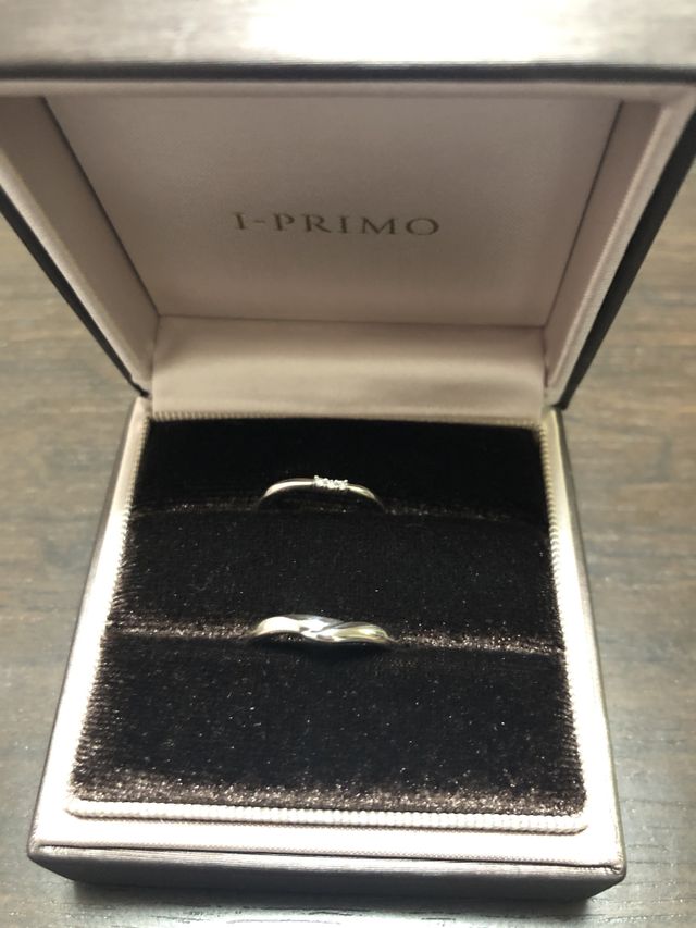 他の人が持ってないような形の指輪がを探していました。アイプリモさんに行き、一目惚れしたU字型のダイヤが少ないものを選びました。夫の物とはペアリングではないが形もよく似ていて、スタッフさんもおすすめしてくれた。