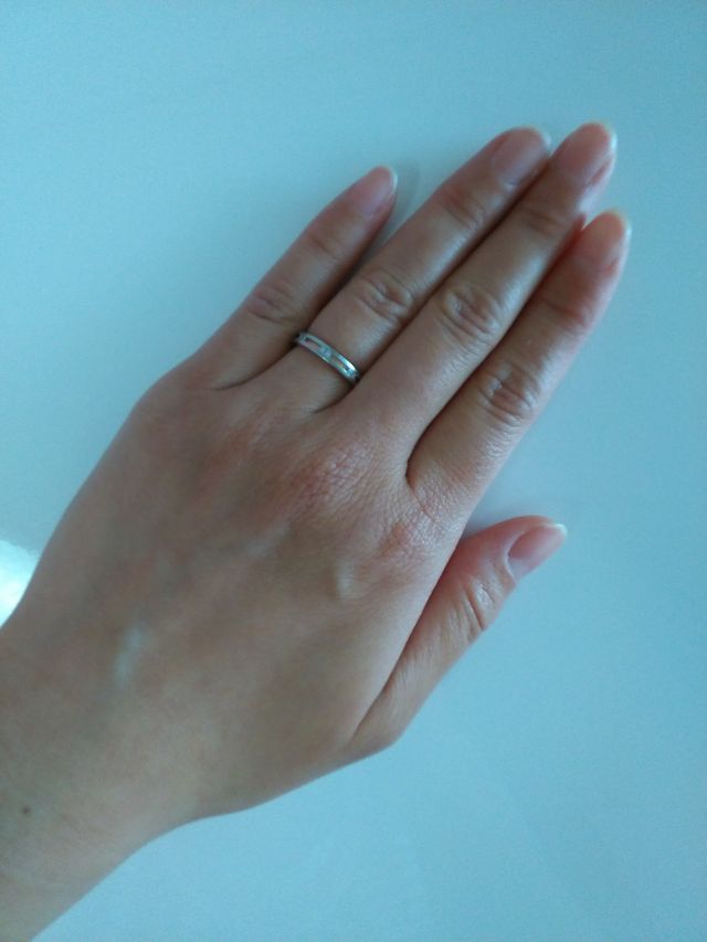 毎日つけるものなのであまり主張しすぎないような指輪にしたいと思い探していました。この指輪はストレートでピンクゴールドのラインが入っていて、シンプルすぎず派手すぎず、つけていて違和感を感じない形だったのでお互いに気に入って選びました。また、二人ともあまり貯金がなかったため、十万前後で済ませたい思っており、価格帯もちょうど良かったというのもあります。