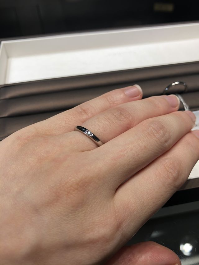 ストレートタイプ、ダイヤモンドが付いていない指輪を探していました。店員さんがぜひと、一石のダイヤが付いた指輪を候補の1つとして持ってきてくださいました。ダイヤのツメ、ダイヤの大きさが控えめ過ぎず、主張し過ぎず、とても綺麗に輝いていました。つけ心地は過去付けてきた他店の指輪と比べても1番良かったです。