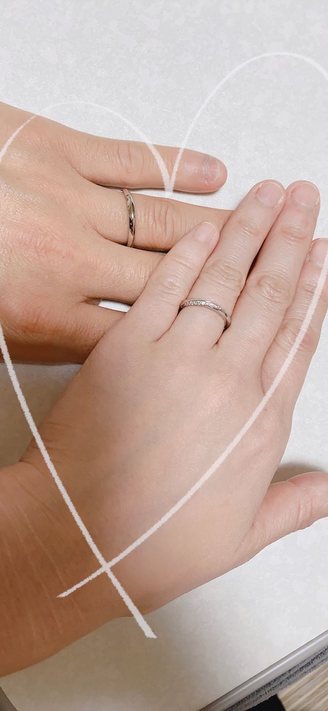 細くて華奢だけどデザイン性もあり、なにより石がこれだけ着いていてもギラギラすることなく上品に輝くところが決め手でした。また旦那は2本のリングを並べると、寄り添い、支えあいながらひとつの未来へと向かうというところを気に入ったようです。