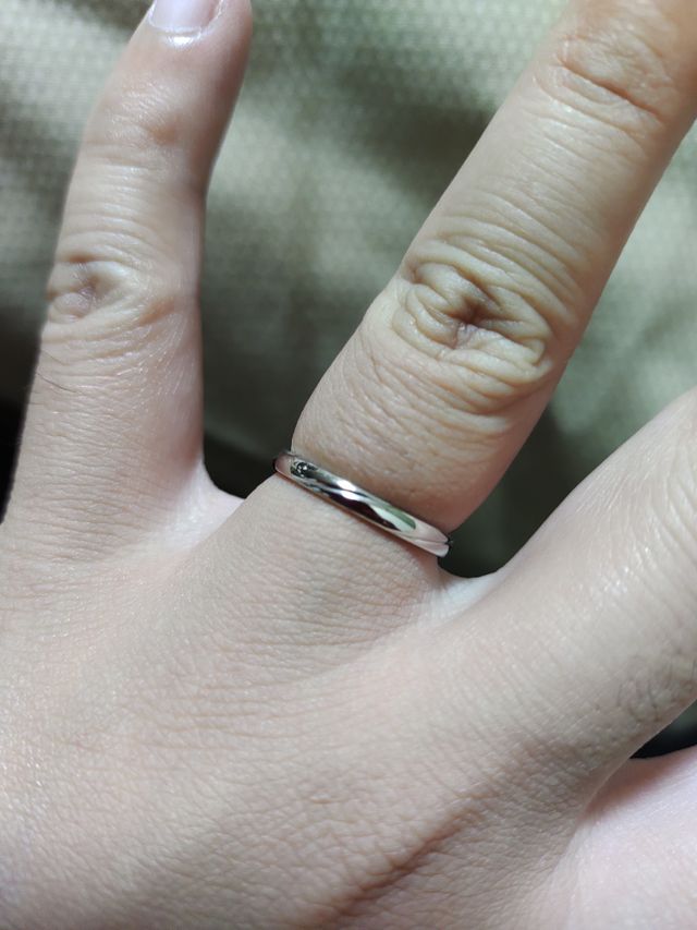 まずはデザインがシンプルでごてごてしていないところがいいと思いました。婚約指輪は多少派手でもいいと思いますが、結婚指輪は毎日するものですので、あまり派手にすると気になってしまうと思ったので、このシンプルなデザインに決めました。