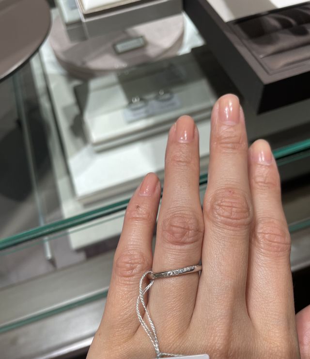 ウェーブのデザインがとても美しく指が細く綺麗に見えました。ダイヤも入っておりキラキラしていてさりげない上品なかわいさです。ダイヤも上等なものを使用し輝いていました。指輪の付け心地もとても良かったです。