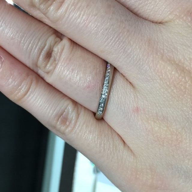 シンプルなデザインでメレダイヤが入ったものを中心に探しており、色々と試着した中でこちらのリングが自分の指に合っていると思い決めました。ダイヤが多めに付いており、輝きがしっかりとして存在感として分かりやすかったのも選んだポイントです。