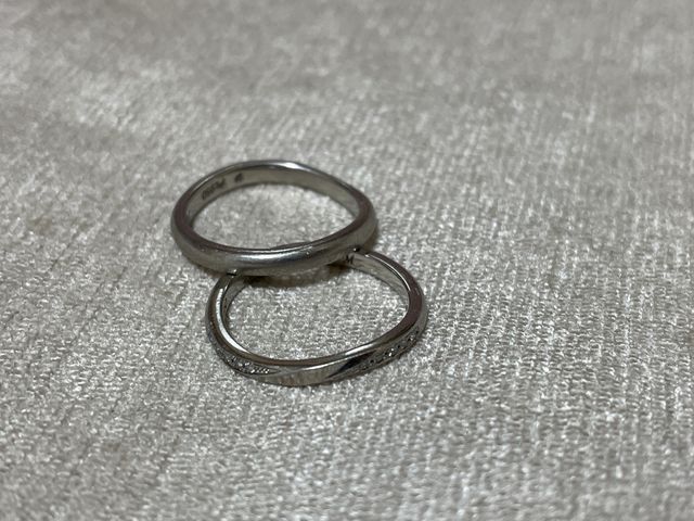 指が華奢に見えるデザインを選びました。ダイヤも小さめで主張が強くなくオシャレで男女共にウェーブがかかっているデザインなのですごく可愛いです。指輪を半周回転させればすごく落ち着いた指輪になるので冠婚葬祭でも気にならないのも素敵だと思います。