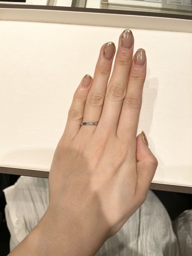 シンプルなデザインで着用時に指が綺麗に見えるものを探していたのでこちらを選びました。ペアでつけた時にお揃いでつけているような、似たようなデザインだったのも選んだ決め手です。金額もお手頃だったので良かったです。