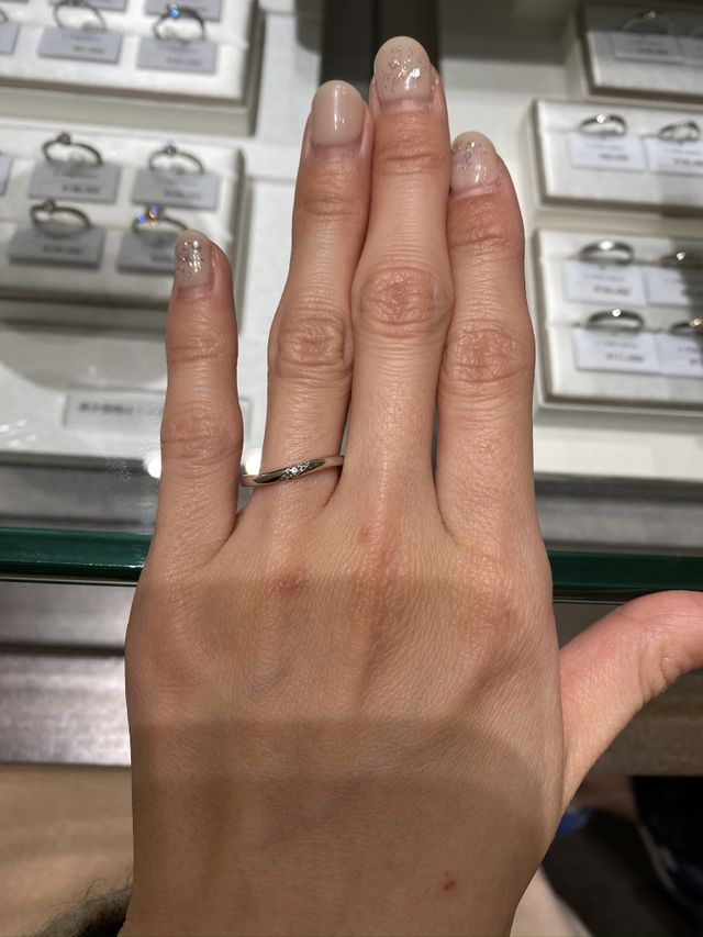 シンプルなものにする予定が、試着してみてキラキラしたものの方がいいなと思い、この指輪に決めました。斜めのラインが指を長くキレイに見せてくれる感じが気に入り、ダイヤモンド部分が、ただ埋め込んであるのではなく高さがついていて、他のものより同じ数のダイヤモンドでも、より輝きがまして見えました。数あるリングの中で一番ピンときた為購入しました。