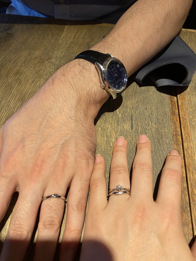 サプライズでプロポーズをしていただいて、その時に用意してくれた婚約指輪が、アイプリモさんで準備いただいたものでした。婚約指輪と結婚指輪とを一緒につけた時に、2つの指輪がキレイに見えるように選びました。