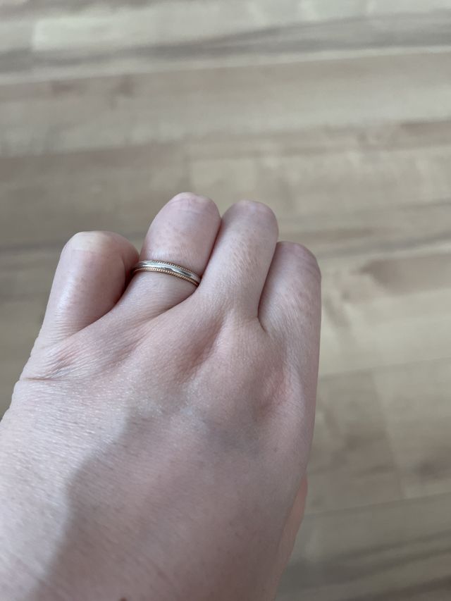 沢山の指輪を見ましたが一目惚れで決めました。180度回っても同じ見た目なのでとてもいいです。ほとんどの結婚指輪は女性だけダイヤが付いていたり、ゴージャスなものが多いですが、こちらは男女とも全く同じデザインなのでお揃い感が特に感じます。