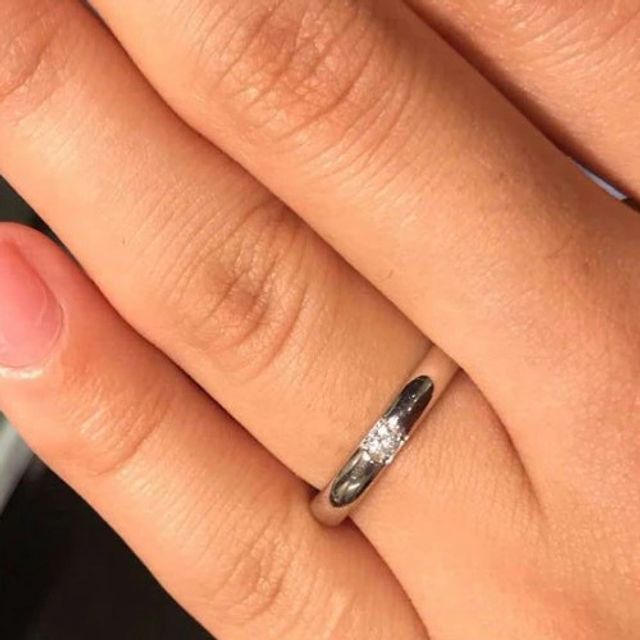 ダイヤモンドがスクエア型に留められておりシャープな雰囲気が出ていて気に入りました。また指への引っ掛かりがなく日常的に使用するのにも問題ない点やプラチナの質感が滑らかである点が着けやすい事もあって決め手になりました。