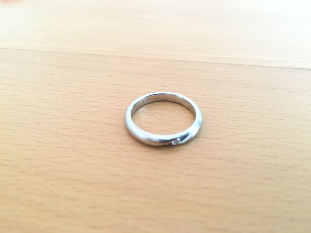長く使うものなので、シンプルで飽きがこないデザインであること、また純度の高いプラチナであることを決め手に選びました。シンプルすぎるのもどうかなと思い、一つダイヤがついているものにしました。3年ほど使っていますが、そのダイヤと斜めのデザインがちょうどよく、気に入っています。