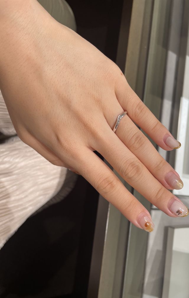 指輪のデザインが好きで、アイプリモさんに決めました。細いリングにダイヤが斜めに入っており、斜めの向きもこだわりがあるようで指が細く見えました。内側にもダイヤを入れることができ、自分たちのオリジナル感を出せるのもいいなと思いました。