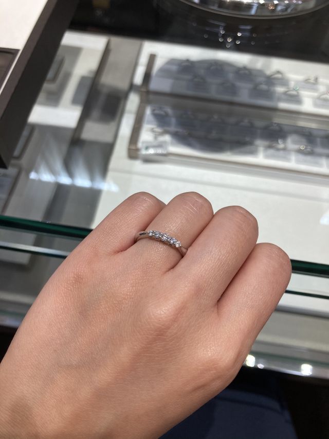 エタニティは石が取れやすそうという印象があるかもしれませんが、他ブランドと比べてこちらのリングは作りがしっかりしていて(でも、ゴツくはない)不安が無さそうだったことも決め手です。