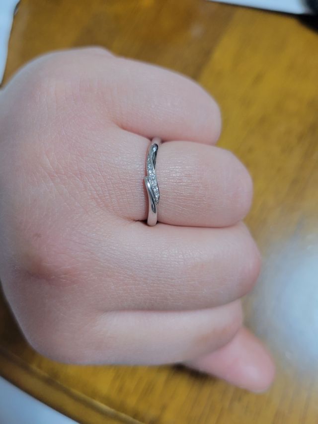 学生時代に柔道をしていたため、間接が太く、指がゴツゴツしているため、少しでも指が長くなるように選びました。Vラインにしようと決めていましたが、それ以外は何も決めずに来店。最初はマットな指輪で探していましたが、やはりダイヤを見ると、ダイヤが素敵に見えて、これに決めました。