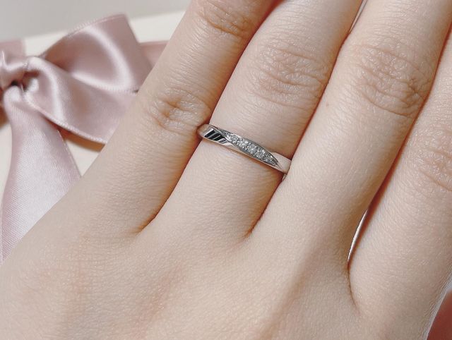 座って一番最初に目に付いたものがこのリングでした。毎日つけるものなので、あまり派手すぎるものは避けたいと思っていたのですが、だからといってシンプルすぎるのも嫌だったので、程よいデザインのものを探していました。エッジが効いたデザインが個性的で、かつ上品さもあって指に馴染むのでとても気に入っています。予算もペアで20~30万円くらいで探していたので、丁度良かったです。