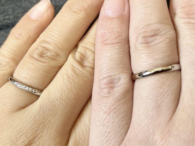 お値段のこともあったので最初は少し価格を抑えたものにしようと思っていたのですが、ずっと付ける物と思うと好きなデザインのものが良いとスタッフさんとも話してお互いに気に入った指輪にしました。同じようなデザインでペアにも見えたので、2人で納得して購入できました!