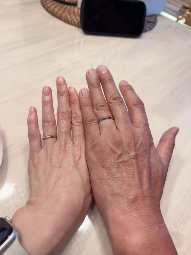 指輪の決め手はデザインですね〜二人とも割と細いので合うデザインを探していました。そんななかでピッタリの指輪をみつけました。シンプルでありながら少しデザインが入っているところと、指輪の太さも少し細身なところが気に入りました。ダイアの大きさや数のバランスも程よく大変気に入りました。