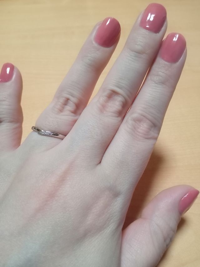 先にネットで確認していて、流線的なフォルムがとても好みでした。実際にリングを見て、やっぱりこれだ!と。色々と他のデザインも見させてはいただきましたが、これ以上のものはなく。第一印象は大事だなと思いました。