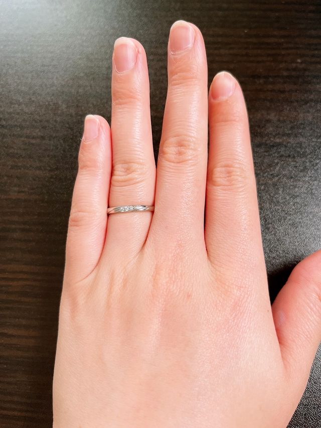 私が探していたリングそのもので、ストレートの台座に斜めでダイヤがあしらってあるので派手にキラキラと輝くものではなく、手につけても目立たないが注意してみると奥深い輝きをするリングです。肌が白い方でも派手に目立たずいいかと思います。