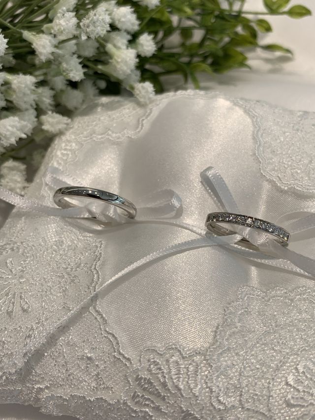プラチナを選びました。キラキラ輝くすごく綺麗なストレートを選びました。デザインが多くてすごくすごく迷いました。悩んで悩んで自分で満足する指輪のデザインにして受け取り日まで長く感じましたが今振り返るとあっという間でした。