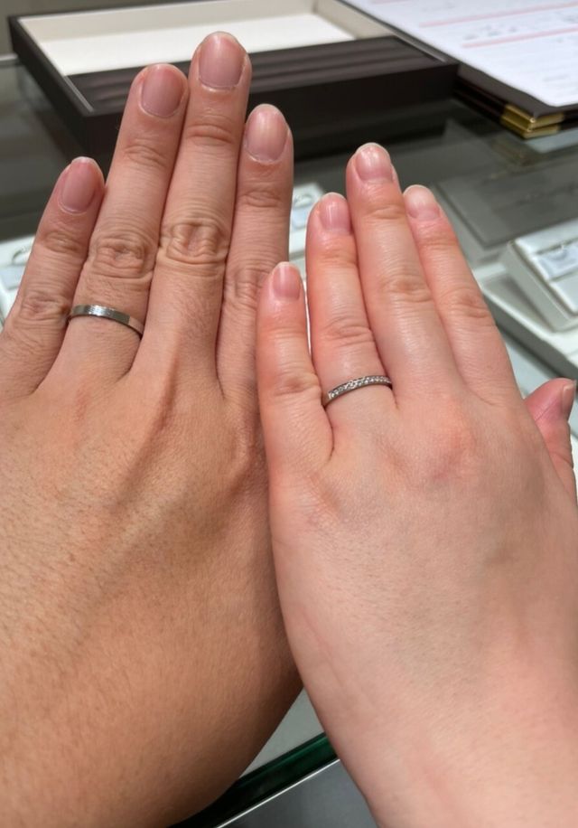 また女性用のハーフエタニティは照明の下でなくてもキラキラとダイヤの輝きが強く、比較的リーズナブルな価格にも関わらず良い品質だと感じた。