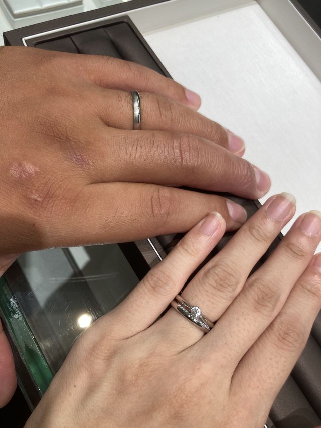デザインが気に入ったので購入しました!おたがいこだわりもあり自分達にピッタリなデザインが見つかりとても満足しています。店員さんの接客も好印象でした。受け取りをして対面した時嬉しかったです。大切にします。