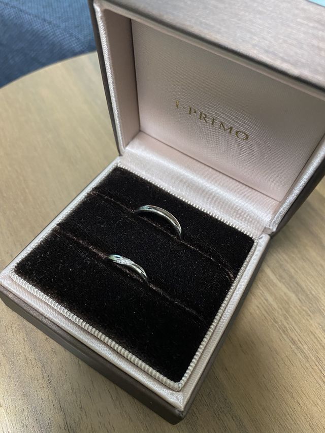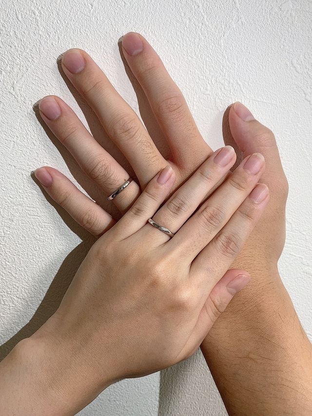 自分の指に合うデザインとダイヤのさりげなさが決め手でした。シンプルでキラキラしすぎない少し細身の指輪を探している方にはぴったりだと思います!控えめにウェーブがかかっており、指を綺麗に長く見せてくれます。