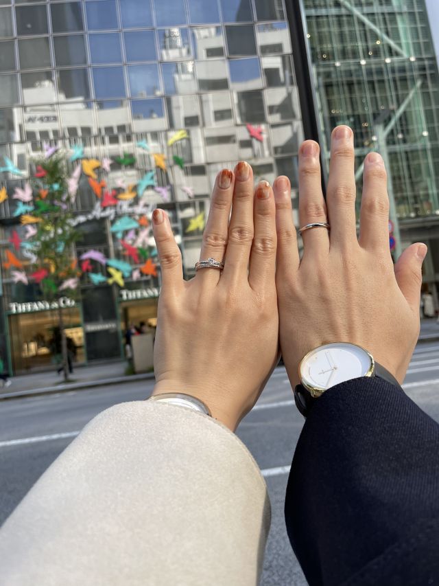 男性用の指輪のデザインも、ななめのラインが入っていて、お揃い感があって気に入ったようです。