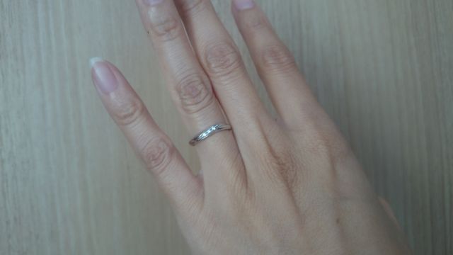 付けてみて自分の指の太さと合っていると感じたのでこれに決めました。斜めにデザインが入っていて、柔らかい印象を受けるし、どのシーンで付けていても邪魔にならず、地味すぎないところがお気に入りです。ダイヤが真ん中に3個ついているので、輝きもあって良いですね。