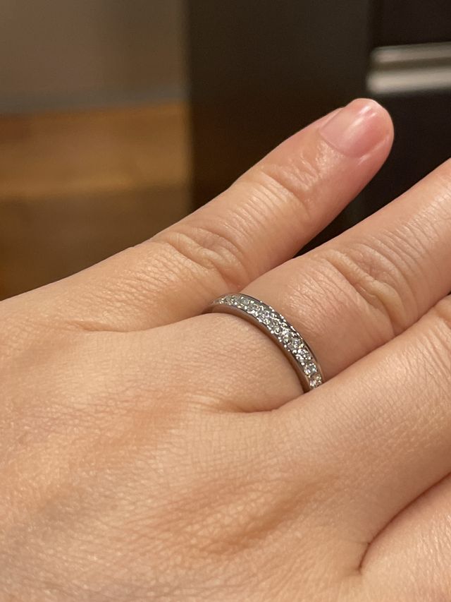 シンプルなデザインですが、キラキラのダイヤモンドが、ならんでいます。いろんなデザインの中から普段していてもじゃまにならない様なこの指輪を選びました。