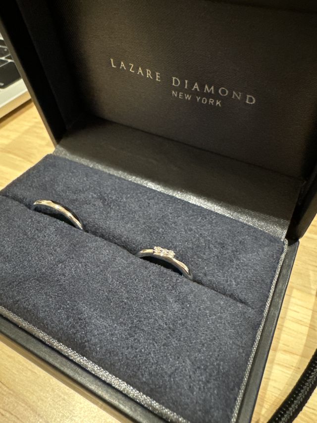 ダイアモンドがとっても綺麗で、手が綺麗に見えるデザインを選びました。旦那さん側の指輪は、ウェーブじゃないものが最初好みでしたが、セットアップでこの指輪の良さを丁寧に教えて頂き、ウェーブでも手が綺麗に見えることからこちらを選びましたえ