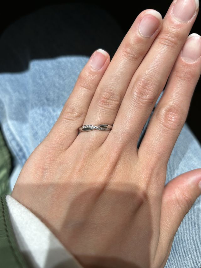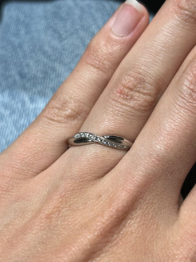 デザインやフィット感がよかった。ウェーブで丸みがかっているからか、かわいい印象。幅感も程よく、ダイヤもたくさんついておりしっかり煌めいていて、気に入った商品だった。一本ラインと違って個性的だと思った。
