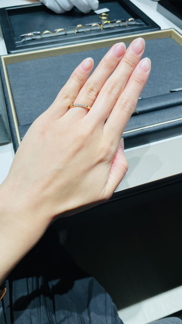 ダイヤの輝きはもちろん、着け心地の良さに驚きました。外資のブランドでは珍しいなめらかさだと思います。ダイヤがキラキラしているので単体で着けても華やかですし、婚約指輪と重ねても収まりがいいデザインでした。
