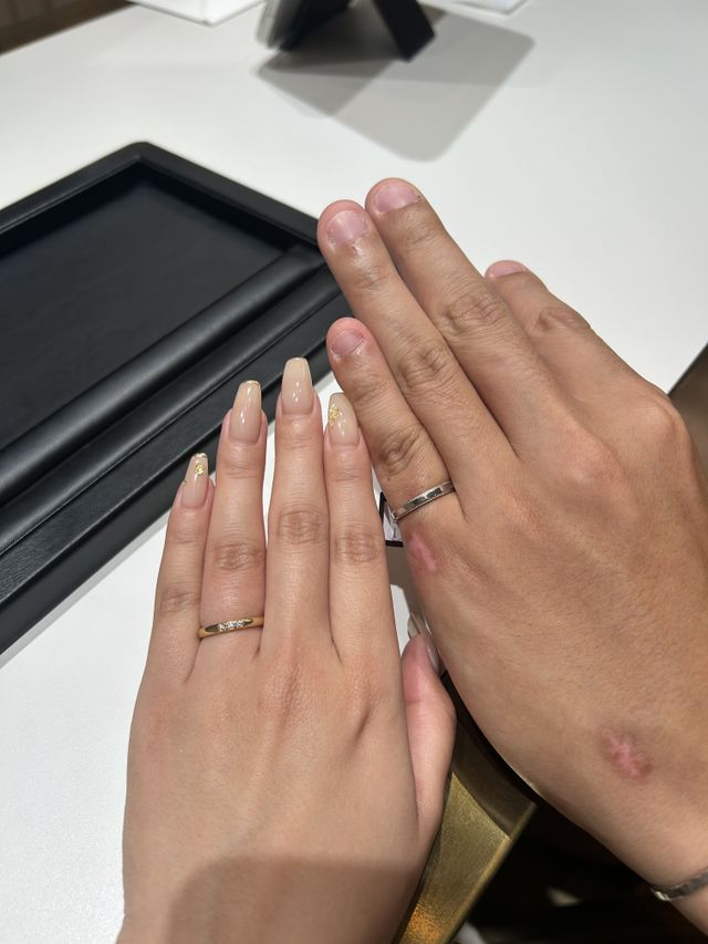 指輪のデザインはペアのものではなく、お互いが似合うものを選びました。私が選んだものはシンプルなストレートのデザインでダイヤモンドの輝きが美しく一目惚れしました。他のショップも見ていたのですが、素人でも分かるくらい美しかったです。彼のものはデザインがシンプルなんですが、あまり見たことがないようなものを選びました。とても似合っていてこちらも即決でした。