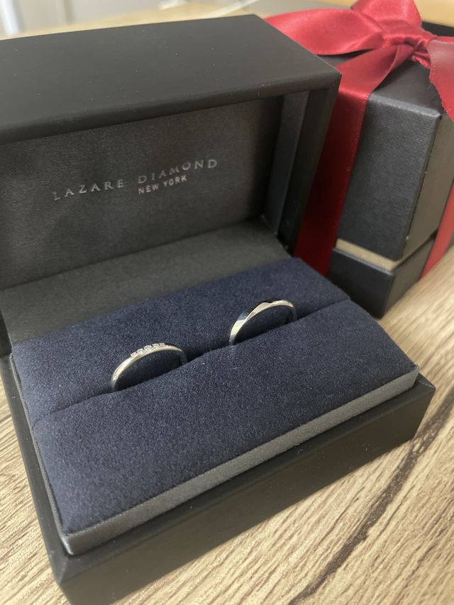 その後、別のお店でも似たようなデザインの指輪を試着させてもらったのですが、婚約指輪と重ね付けした時のフィット感、金額に対するクオリティの高さ、ダイヤの輝き、そしてこだわりをたくさん聞いてアドバイスしてくださった店長さんが決め手となり、購入しました。