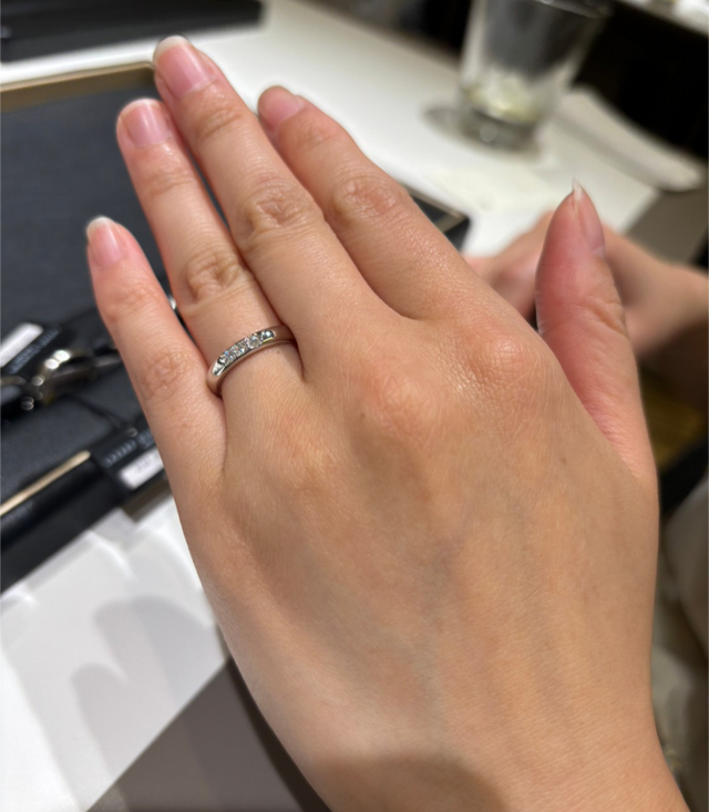 すごくシンプルなのですが、リングの太さとダイヤの数をカスタムできるので、自分好みに仕上げられるのがいいなと思いました。他ブランドではなかなかない太めのものがなかったので、先をみこして少し太めのものを試着しました。