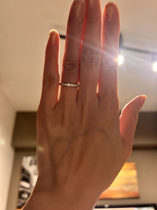 アプローズはエタニティリングというジャンルのリングで、結婚指輪よりも華やかで婚約指輪に近い印象のリングです。このリングは手の甲側には全般にダイヤモンドがあり、かつダイヤモンドが出っ張るつくりではなくリングに埋め込まれたようなつくりなので、ダイヤモンドが取れる心配が少ない点が安心だと思いました。