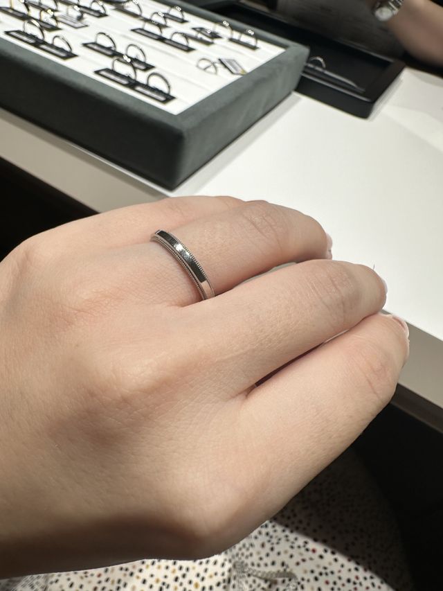 いろんなブランドのミル打ちを見ており、その一つでラザールダイヤモンドさんのミル打ちを試着させていただきました。細かいミル打ちがとてもら可愛く、シンプルでありながら飽きのこないデザインだなと感じました。