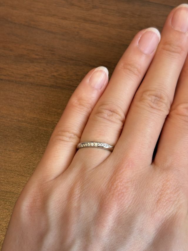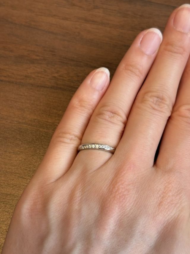 ダイヤが入っていて、かつ、デザイン性のある指輪が欲しくて、この指輪を選びました。細かいダイヤが上品にキラキラ光るので、普段使っていてテンションが上がりそうです。素材も丈夫とのことだったので、ずっと付けられそうです。