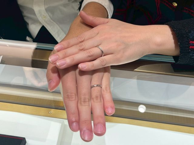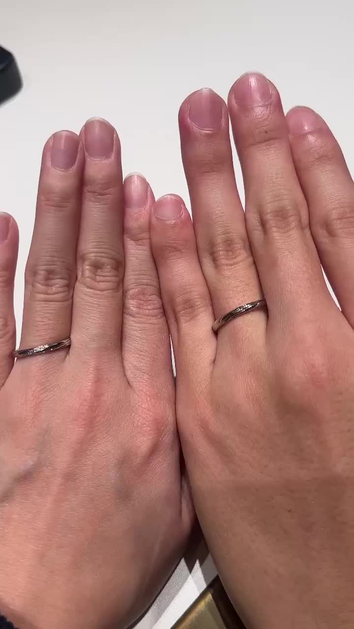 いくつか探した中で、1番指が綺麗に見えて、ふたりのペア感をしっかり感じられる指輪でした。ダイヤの入り方も控えめなのに存在感があり、デザインはシンプルだけど他にはない個性があって、とても気に入っています。