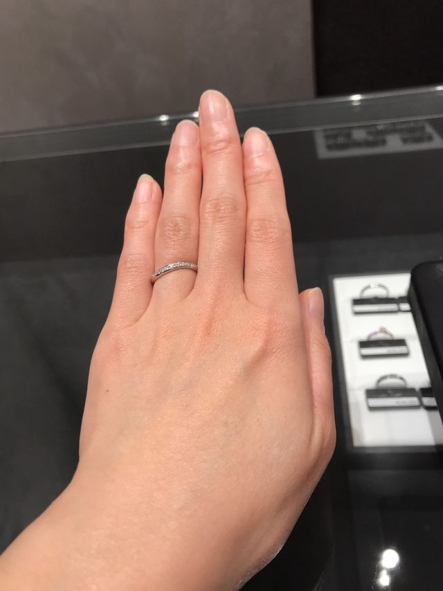 小さいダイヤモンドが沢山入っており、キラキラしてとても可愛かった。小さなダイヤモンドもとてもキレイで、また、ウェーブが、指を細く見せてくれてよかった。