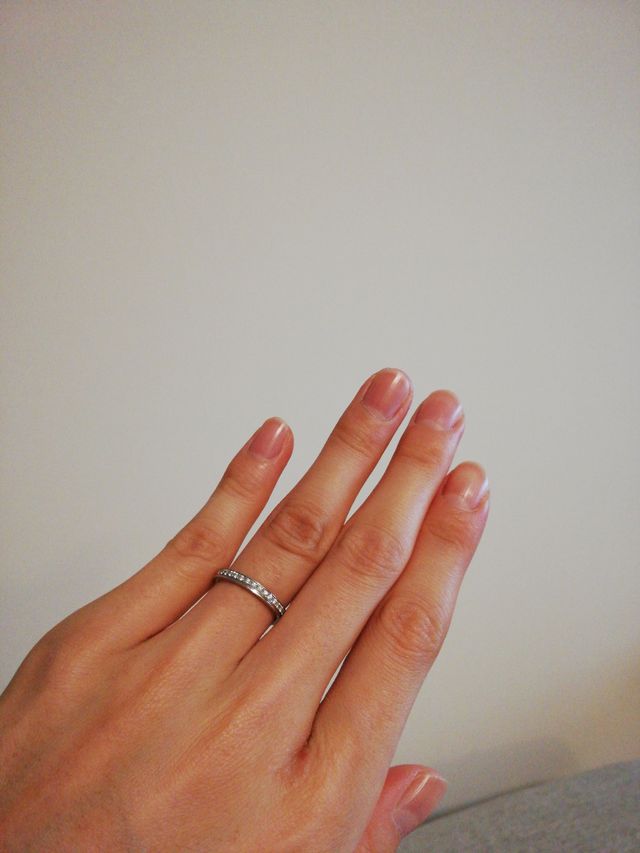 上下で重ね付けしたようなデザインが気に入り購入しました。ハーフエタニティですので、たまにくるっとまわってダイヤが隠れてしまうのですが、裏にもデザインがあるので気にせず使えるのもいいなと思いました。とても可愛くて3年たった今も友達に褒められるお気に入りの指輪です!