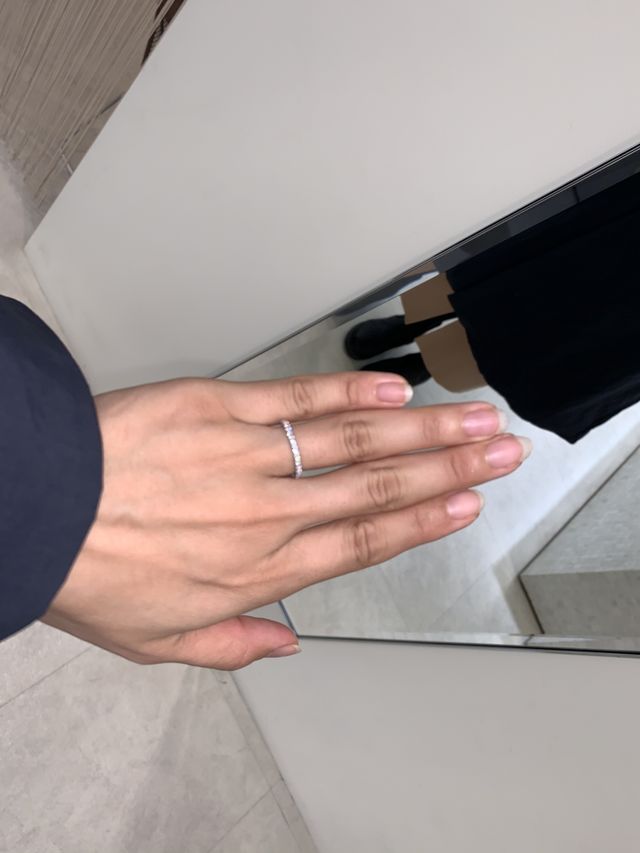 とにかくダイヤモンドの輝きが素晴らしいです。他のエタニティとは違う石の留め方をしているので、輝きが抜群です。キラキラと綺麗に輝き、ギラギラとしたいやらしさが全くなく、繊細です。価格も大変良いと思います。この輝きでこの値段でいいの?というくらい綺麗です。