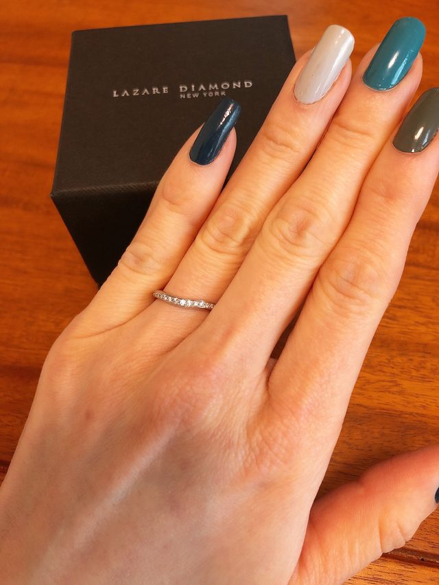 とにかくダイヤモンドがキラキラ輝いていて他のお店でみたものよりとてもキレイで気に入りました!デザインも指をキレイに見せてくれるし、細めながらも表面のダイヤで上品な存在感があります。やっぱりキラキラしてるとテンションがあがります!
