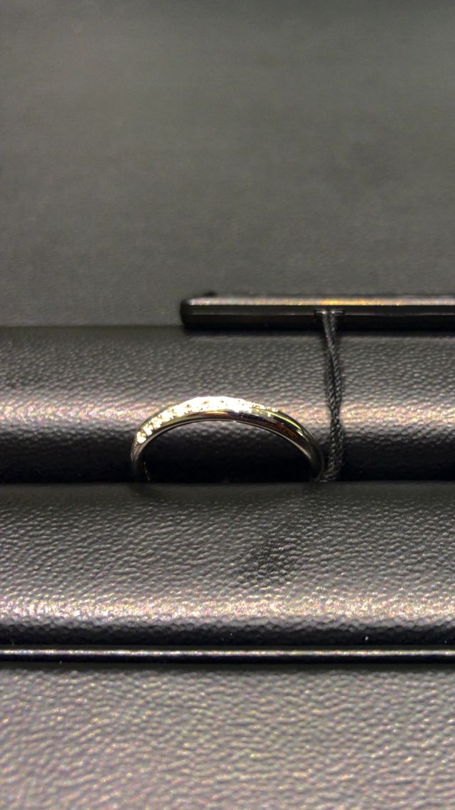 メレダイヤが斜めに並んだストレートタイプの指輪です。ダイヤは中央が大きく左右に向かって小さくなっていて、流れるようなデザインが気に入りました。男性用はダイヤなしで斜めに線が入っているデザインで、男女ともにシンプルかつ、おそろい感があっていいなと思いました。