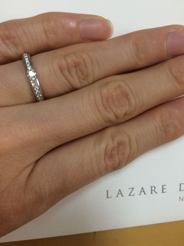 仕事上指輪の装着ができないこと、婚約指輪を購入していなかったことから、キラキラとした結婚指輪が良いと考えていました。5店舗を巡り、ハーフエタニティに決めましたが、どれも似たようなデザインで、なかなか気に入るものに出逢えませんでした。知人からLAZARE DIAMONDを教えてもらい伺いました。1つだけ真ん中のダイアが大きく、婚約指輪の感じもあり、また他店にないデザインに一目惚れし、アプローズに決めました。