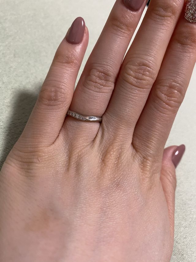指馴染みがよく、人とかぶらないデザインでした。V字ラインで片方のみ装飾がついているデザインが好みで、ダイヤモンドもとても綺麗だったため、一目惚れでした。最初はシンプルな装飾なしのものを検討していましたが、日々つけることを考えると自分好みのものに決めてよかったと思いました。