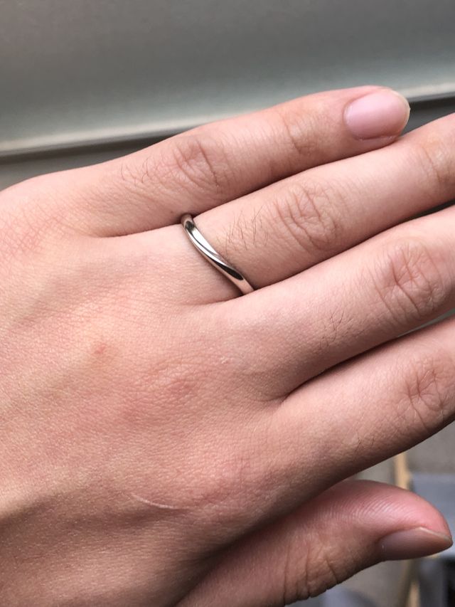 自分の指輪のデザインは特にこだわりはなく、彼女の付けたい指輪と同じシリーズの指輪をつけたかったので、